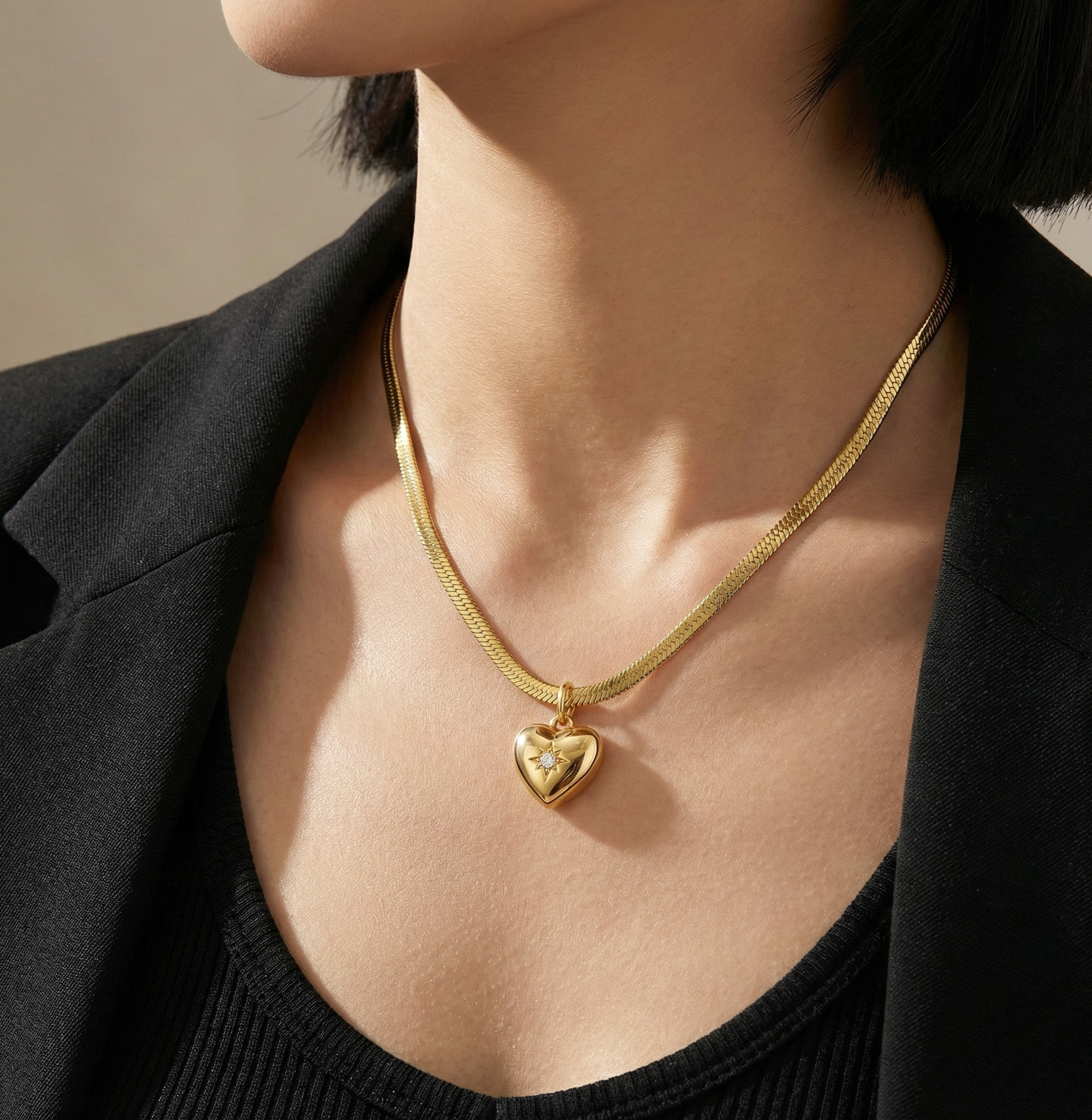 On-Trend Aesthetics: Puffy hearts and snake chains are currently top trending jewelry styles.