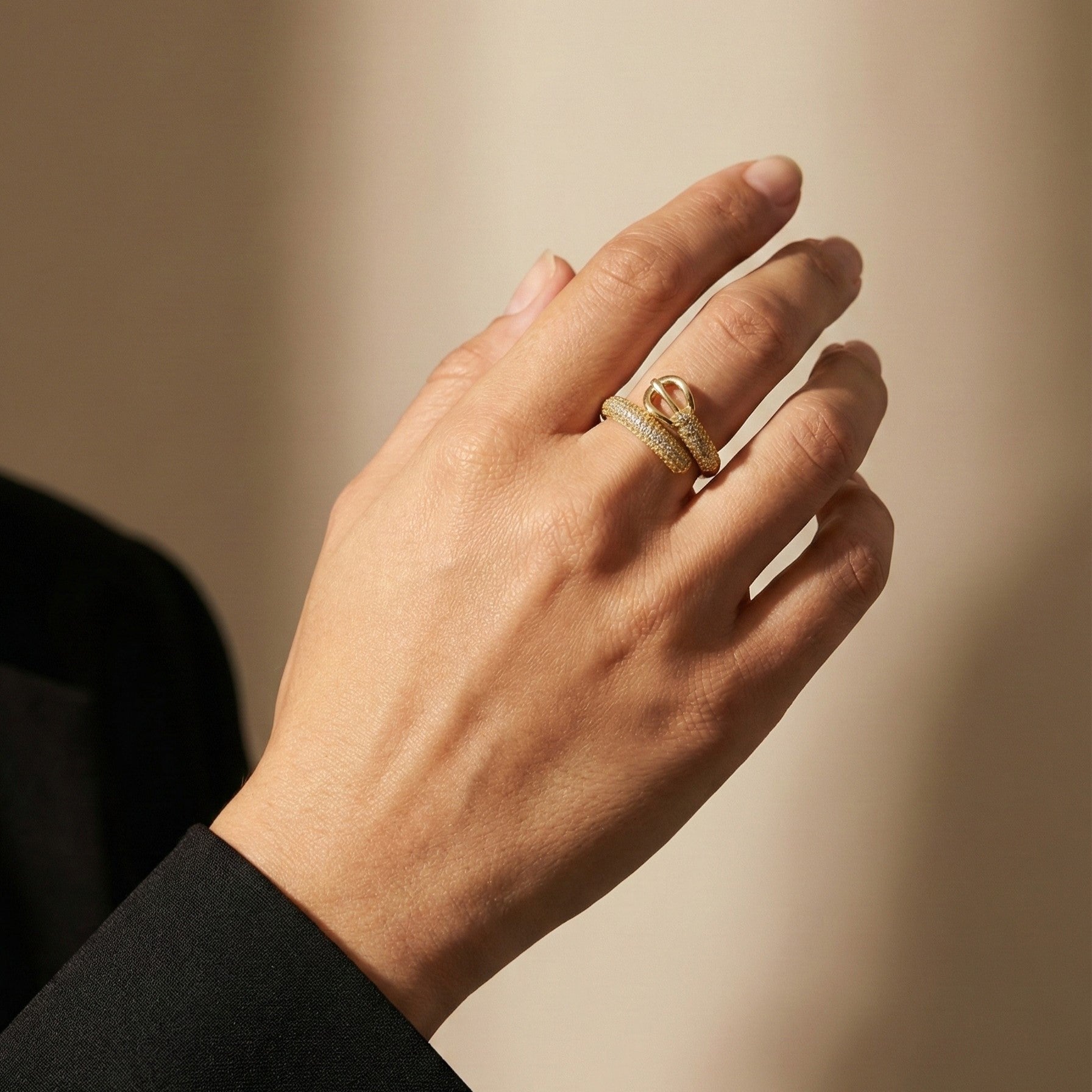 The contrast between the smooth, architectural loop and the glittering band creates a piece that feels both structured and fluid. It is the ultimate finishing touch—polishing off your look with the same authority as a designer belt or handbag.
