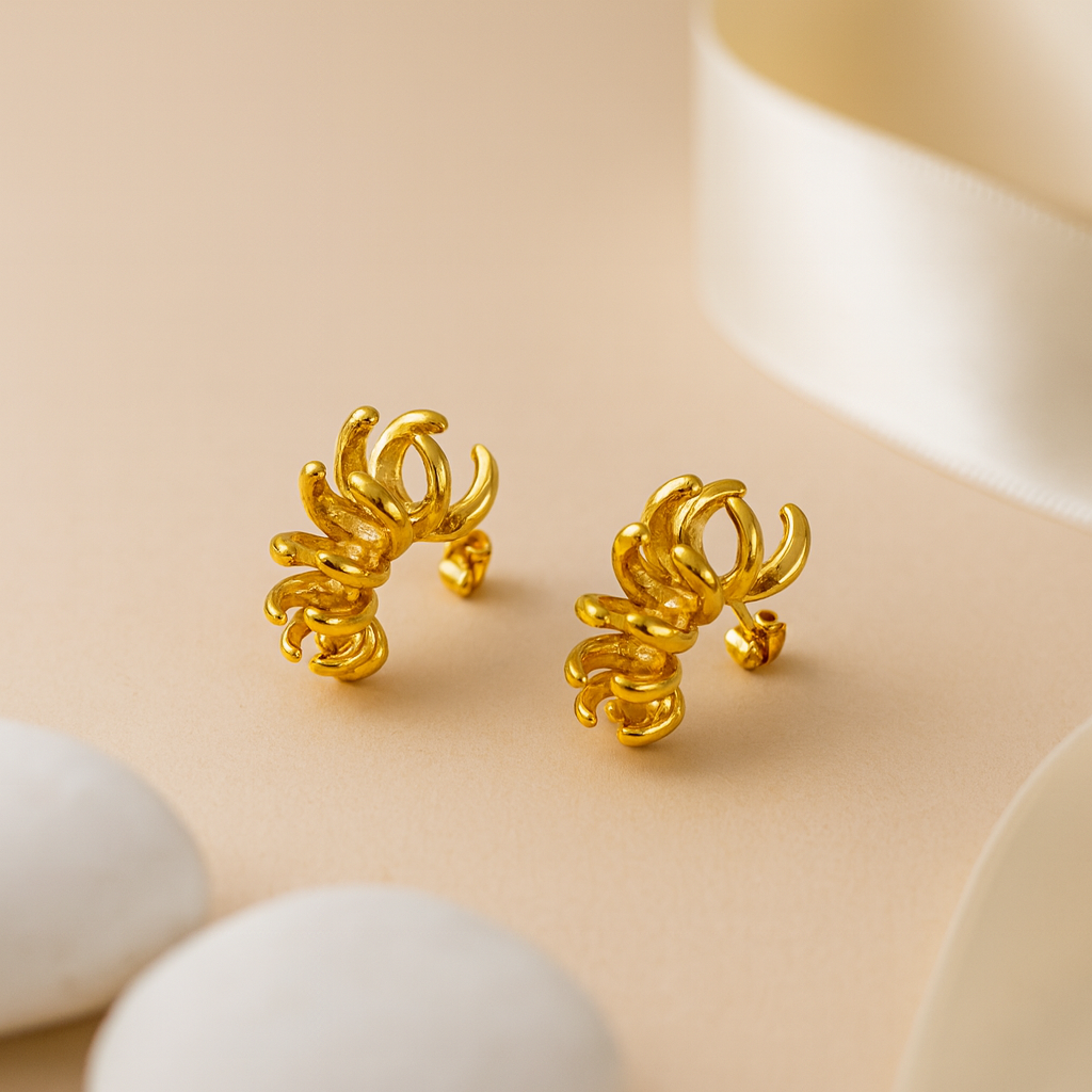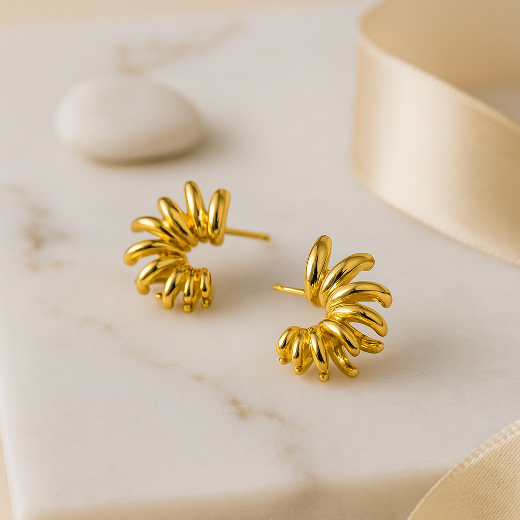 Graceful and radiant, the Celestial Curl Earrings capture the movement of light in every curve. Crafted in 18k gold plating over stainless steel, their sculptural, petal-like design adds a modern twist to classic elegance. Lightweight yet striking, they transition effortlessly from day to night — a statement of sophistication in every swirl.