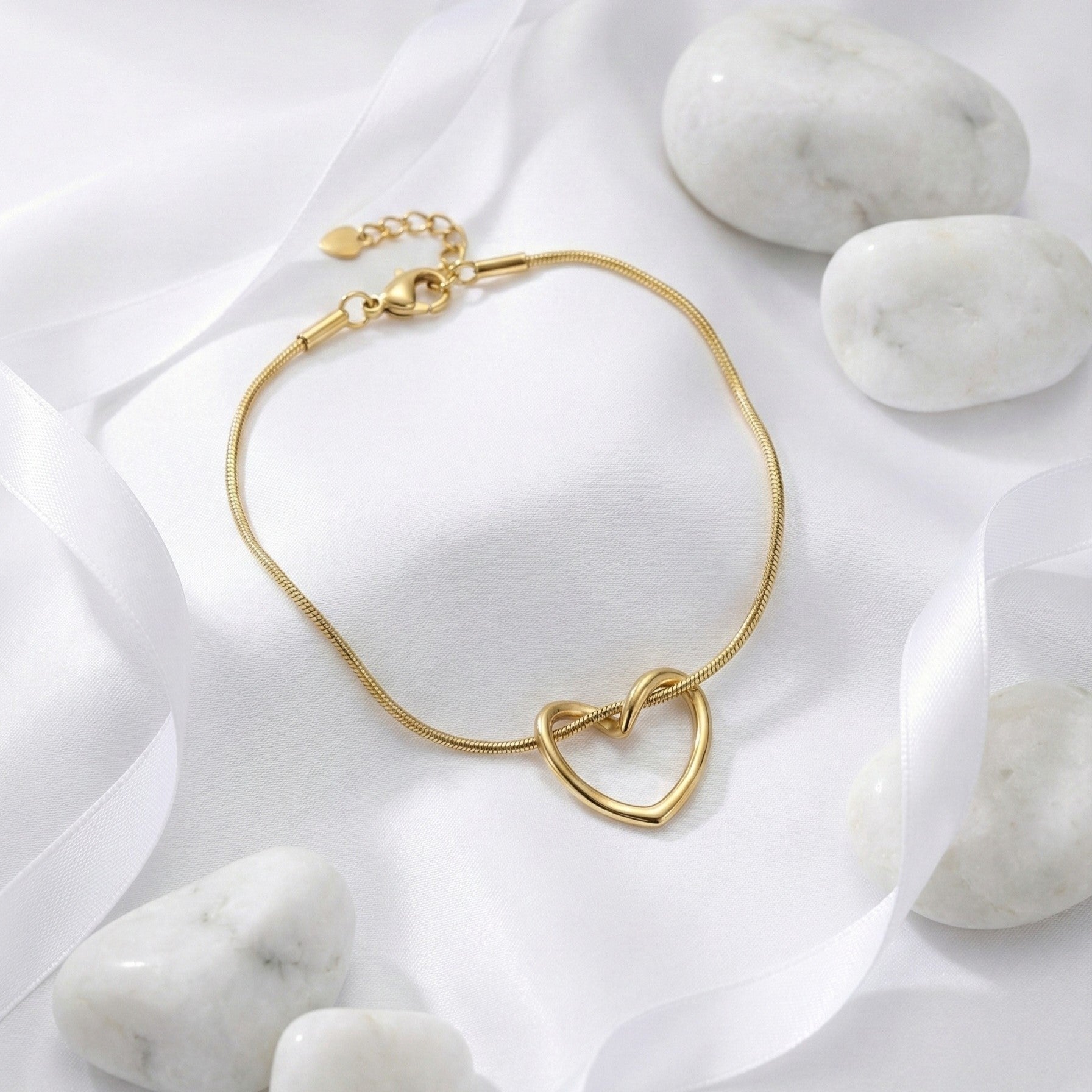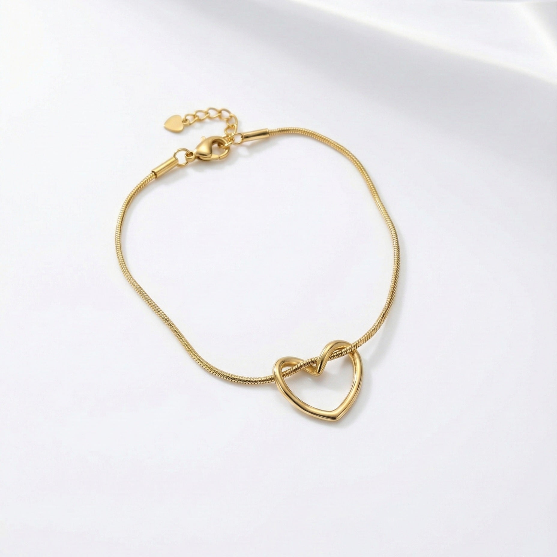 Simple, sleek, and undeniably romantic. This bracelet features a lustrous gold-tone snake chain that elegantly loops through an open heart silhouette, creating a unique knotted effect. The smooth texture of the chain glides comfortably against the wrist, while the adjustable extender ensures the perfect fit. A modern minimalist staple that looks beautiful worn alone or stacked with your favorite watch.