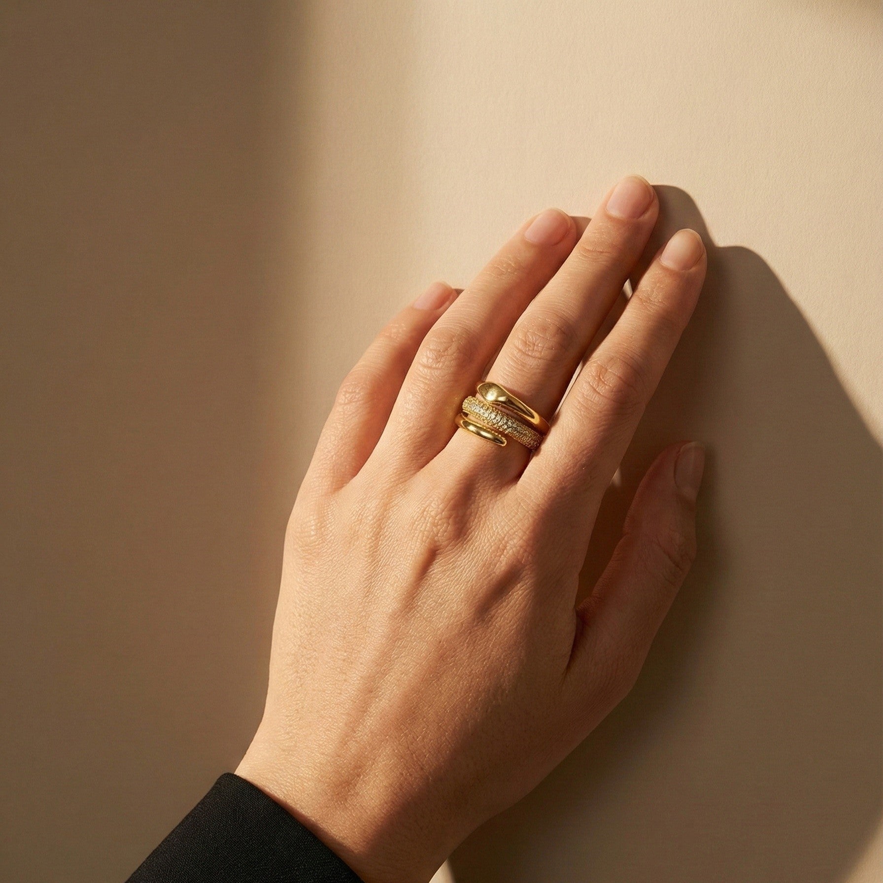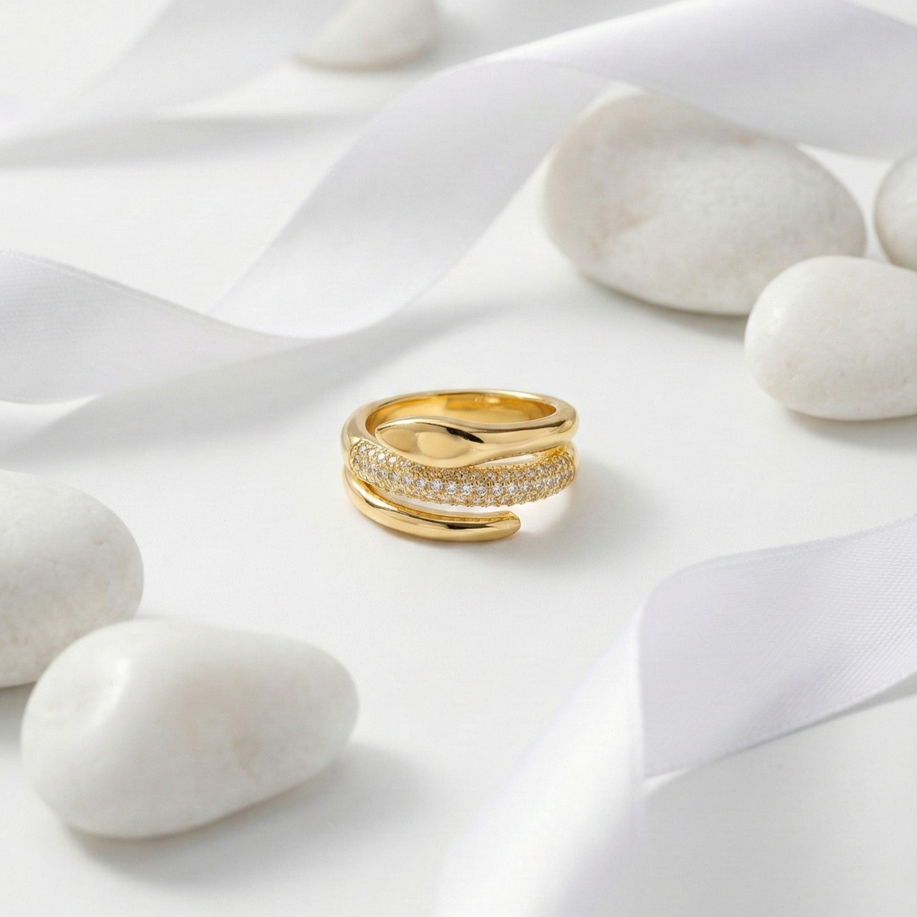 The contrast between the sleek, liquid-golden top and the textured, sparkling band creates a mesmerizing visual depth. It coils elegantly around the finger, offering a bold statement of transformation, wisdom, and power.