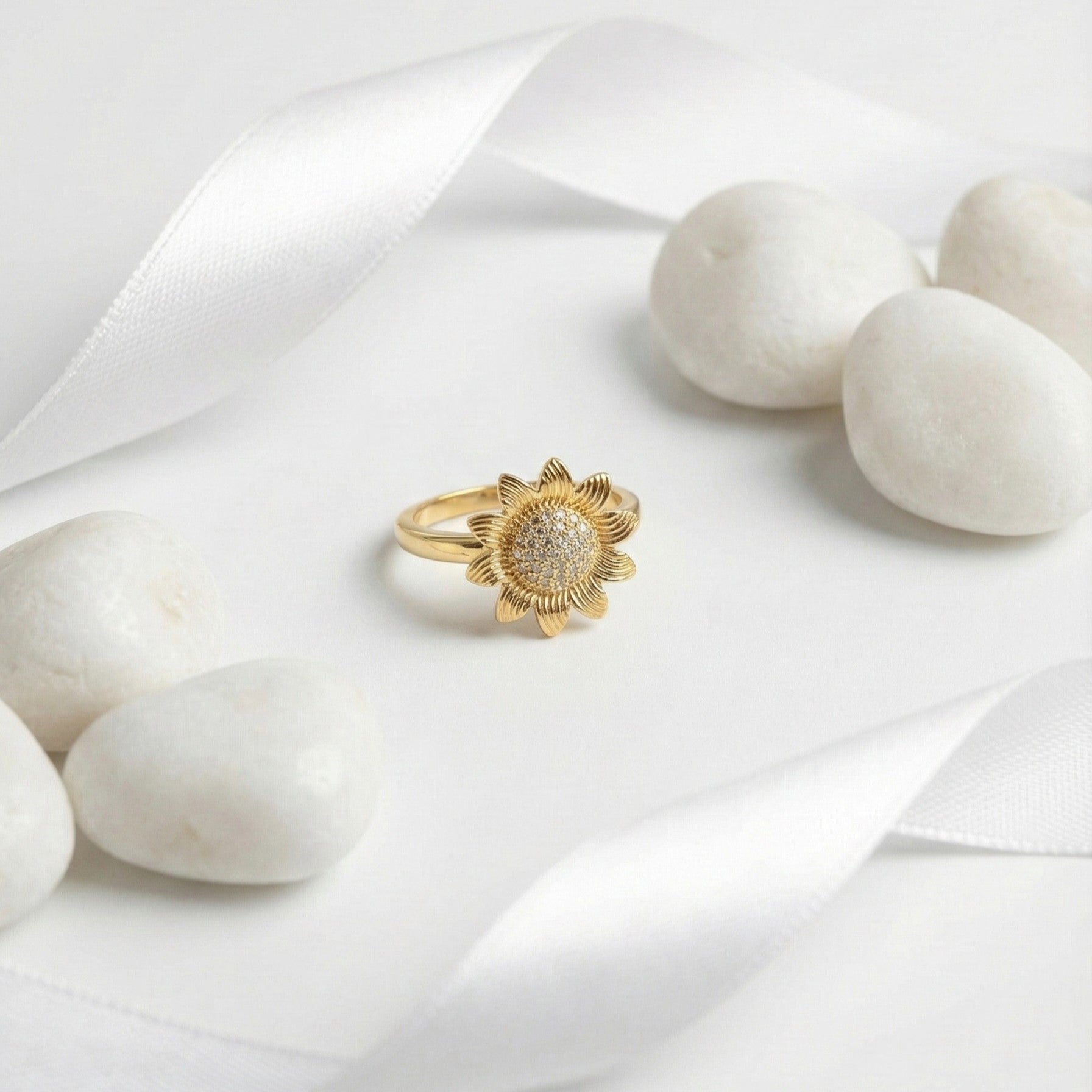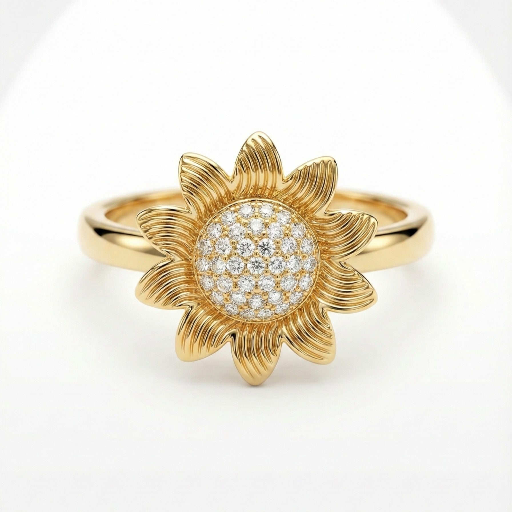 Each petal is detailed with fine, etched lines that catch the light, creating a sense of movement and depth. It is more than just a ring; it is a wearable ray of sunshine, designed to bring warmth and brilliance to your everyday style.