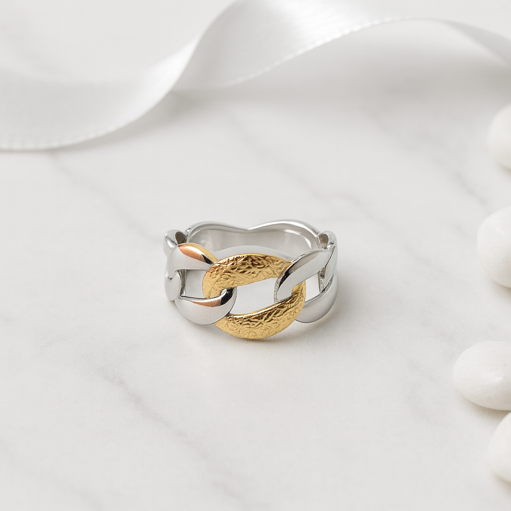 A piece for someone who values bold elegance, structure, and the beauty of contrast — light and shadow, raw and polished, golden and silver working as one.
