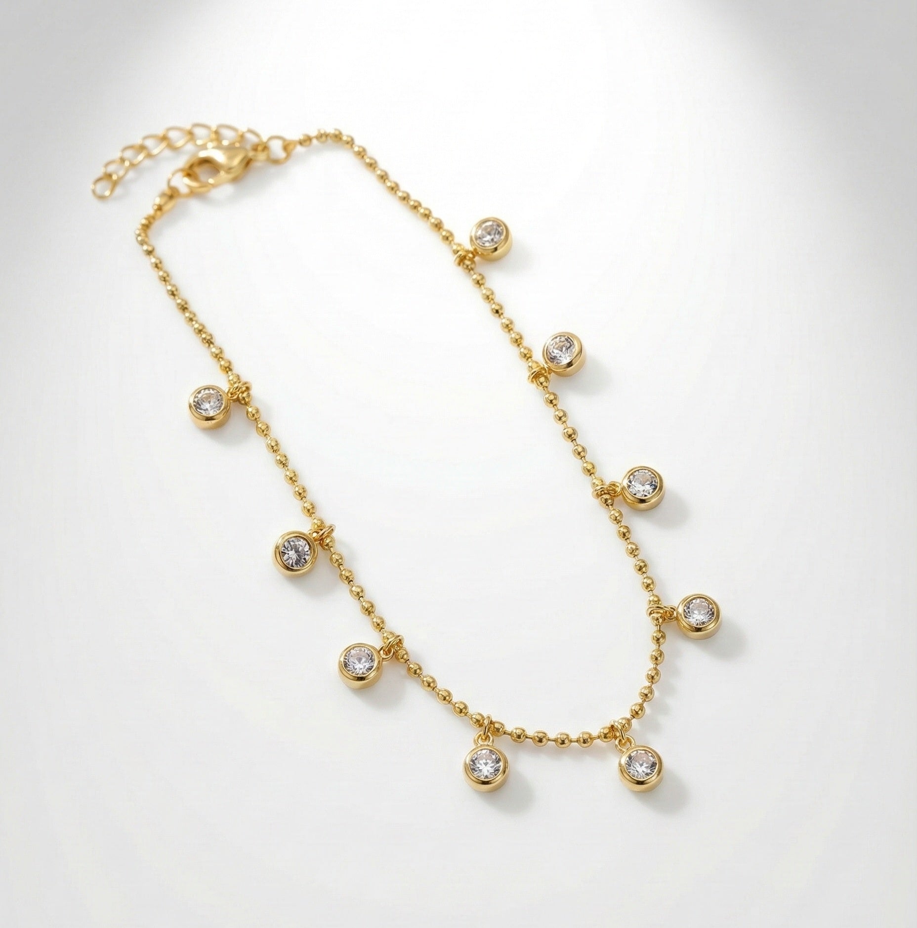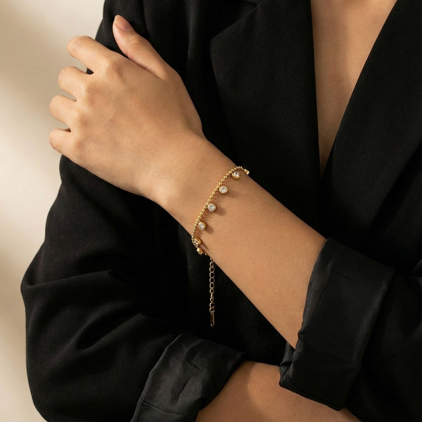 Catch the light with every move. This dainty bracelet features a delicate gold-tone beaded chain, punctuated by shimmering round crystals in bezel settings that dangle freely like drops of morning dew. It’s the ultimate layering piece—playful, feminine, and full of movement. Whether worn solo for a hint of sparkle or stacked with a watch or bolder cuffs, it adds an instant touch of radiance to your wrist.