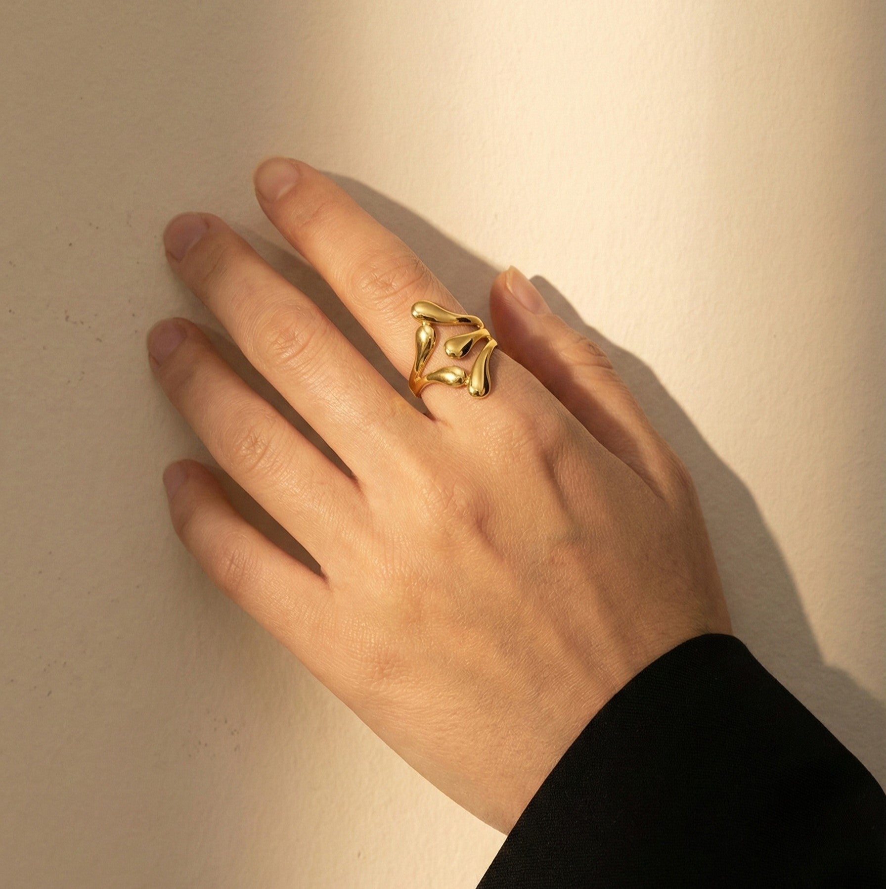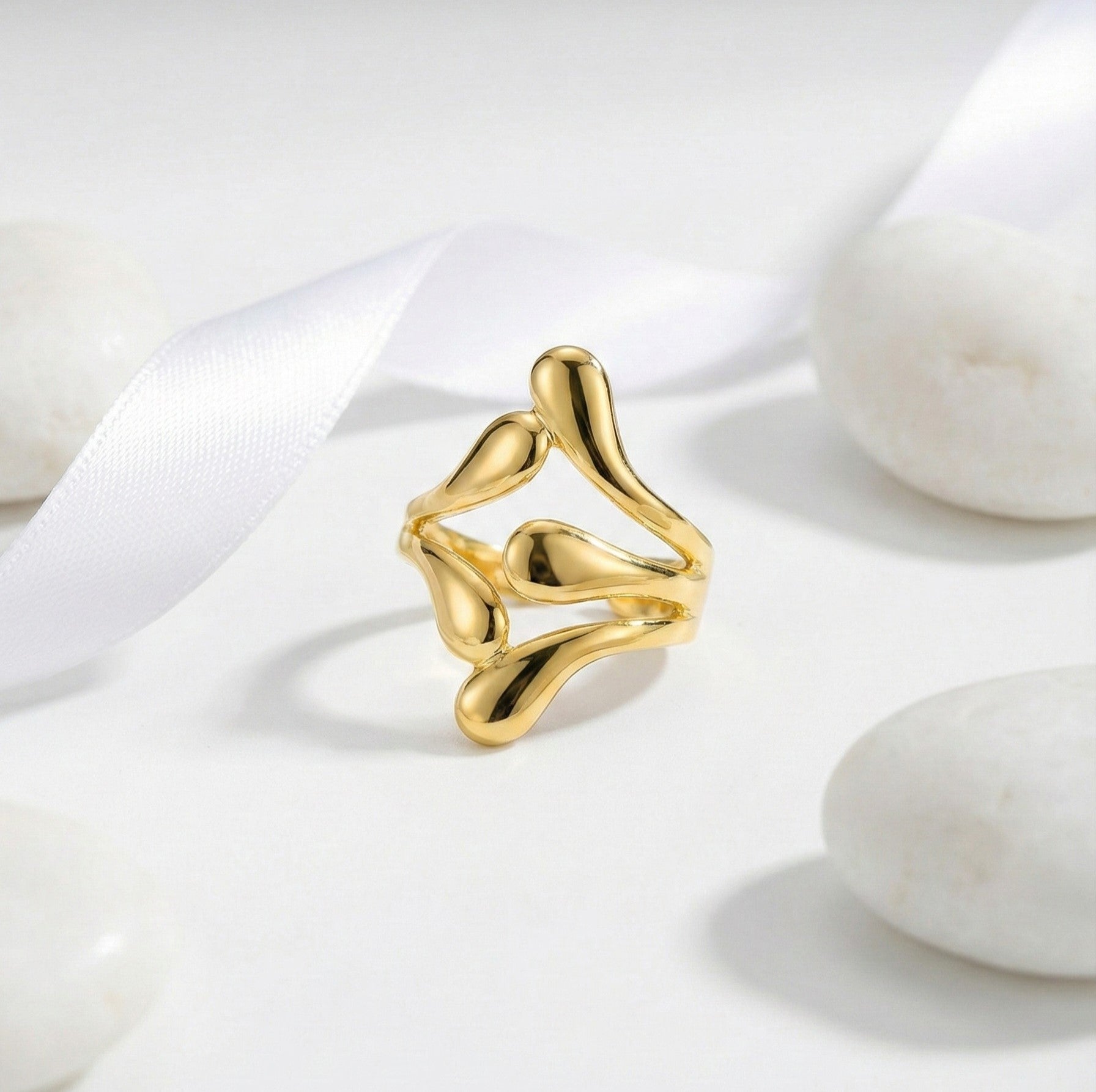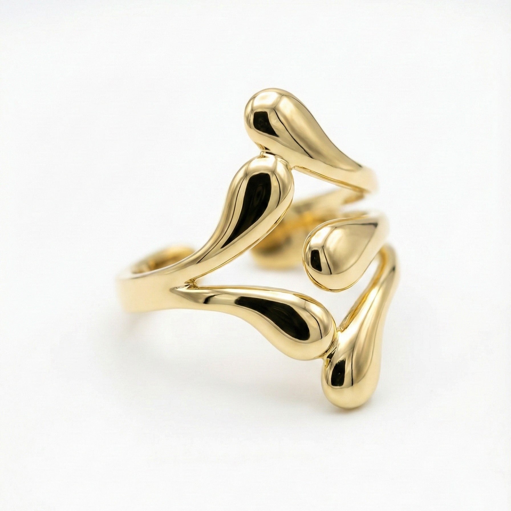 Design: Intertwining fluid lines with weighted, teardrop accents.