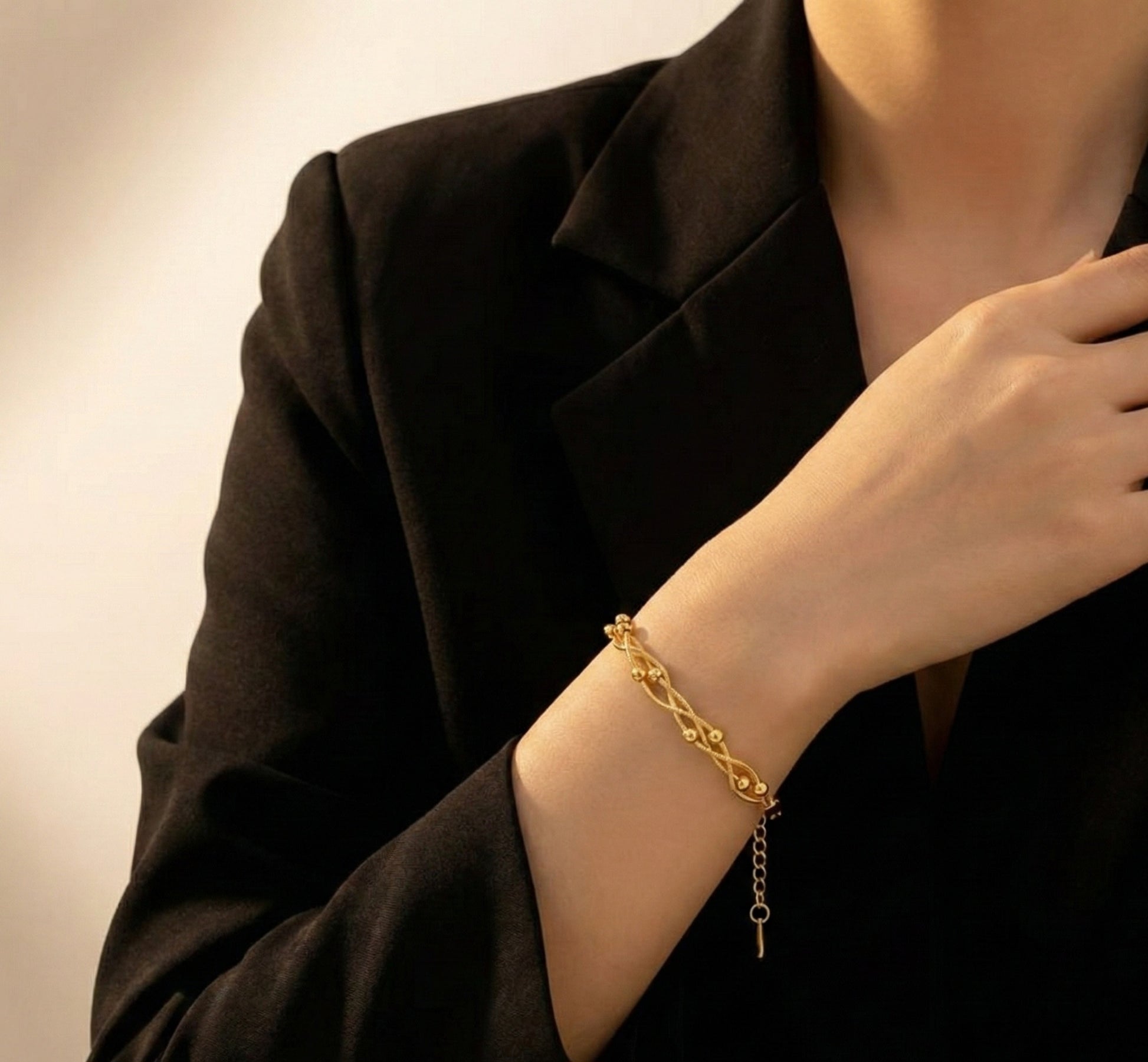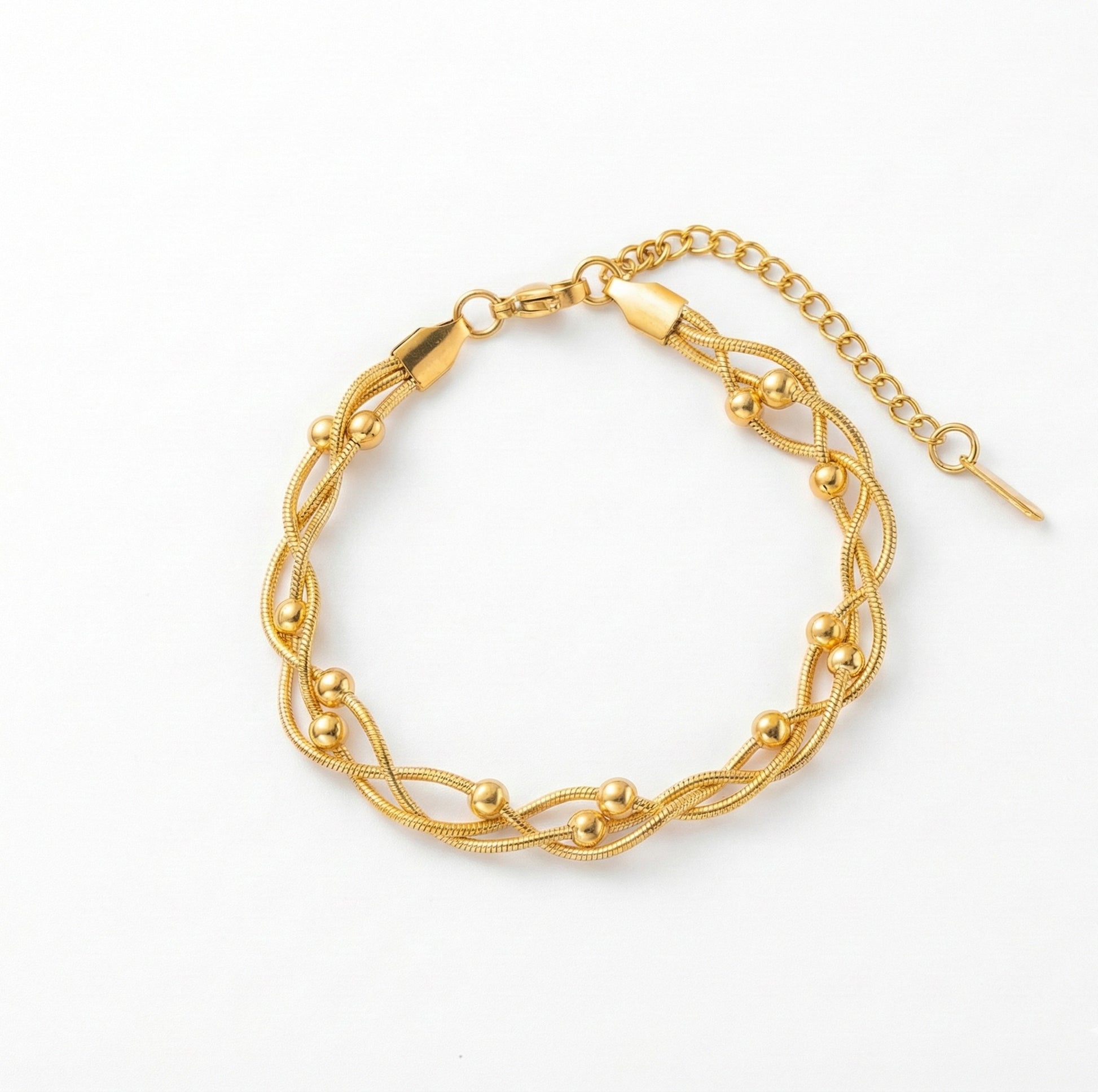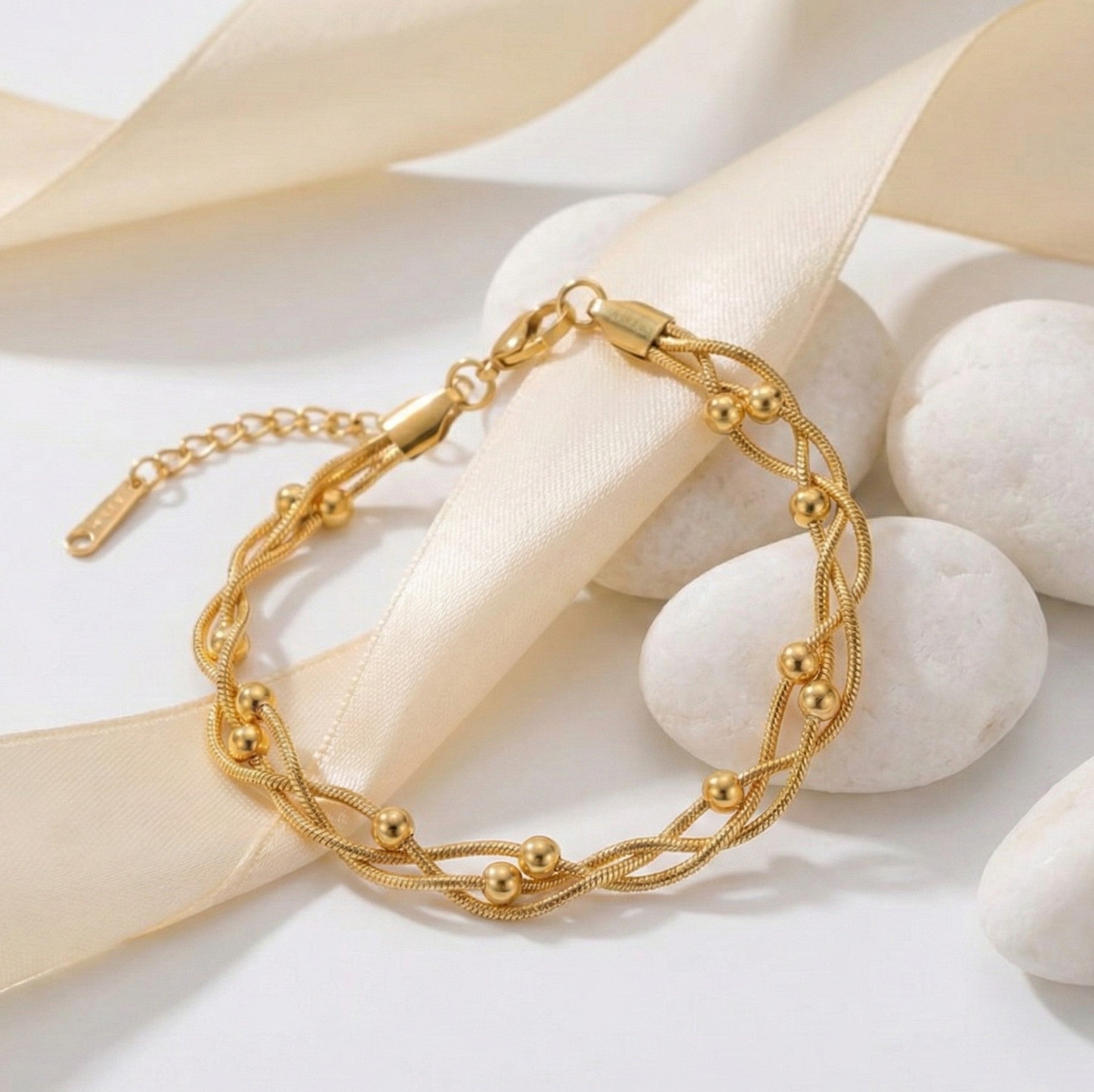 Layered luxury in a single piece. ✨ Featuring intertwined gold strands and scattered beads, this bracelet captures the light from every angle. It’s the perfect blend of modern texture and timeless golden warmth.