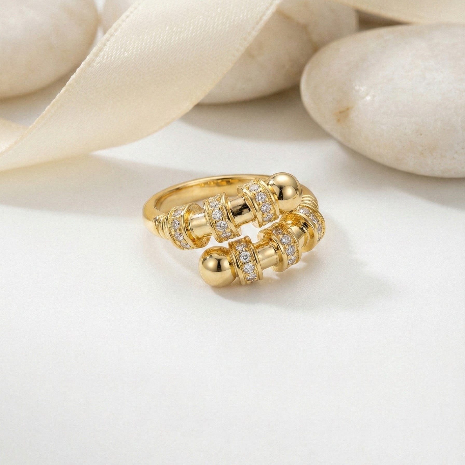 Capped with polished gold spheres, the open-ended design wraps the finger in a bold embrace of light and structure. It is complex, substantial, and undeniably luxurious—perfect for the woman who appreciates the finer details.