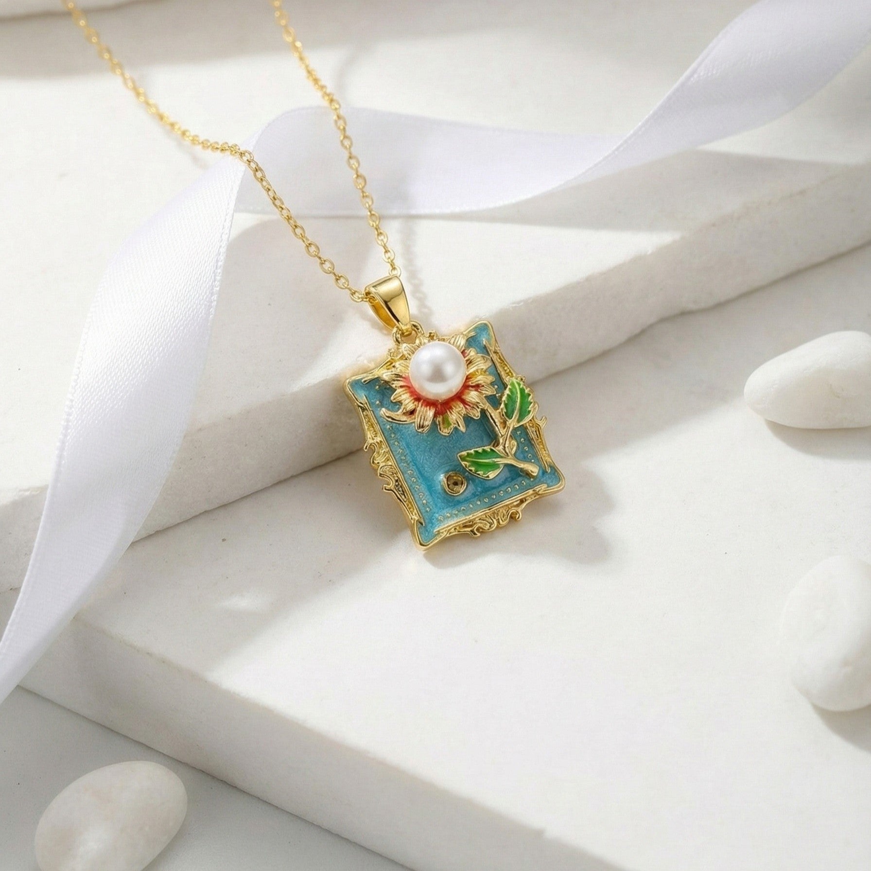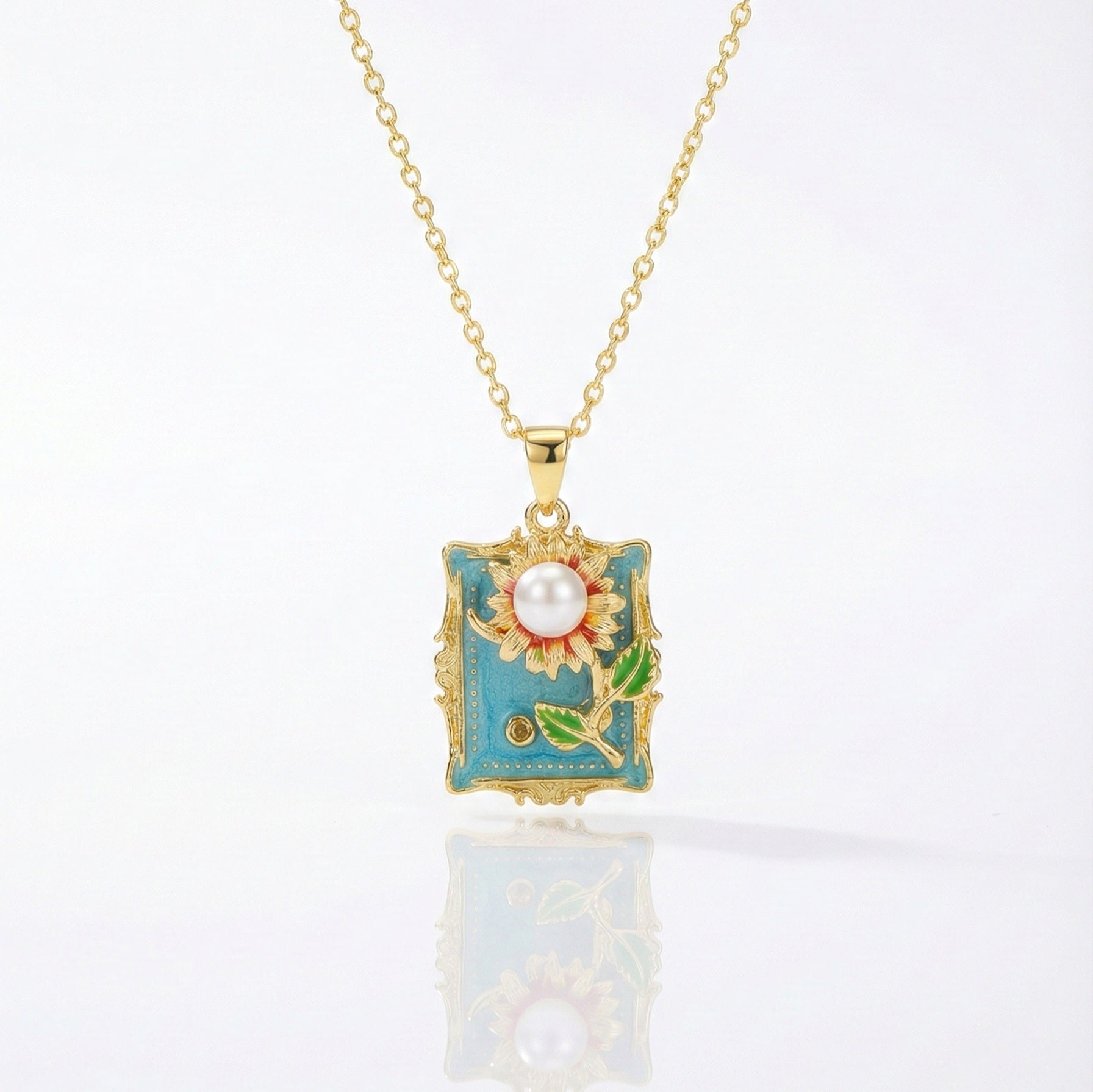 Wear a piece of eternal summer. This stunning vintage-style pendant features a textured blue enamel background, reminiscent of a clear summer sky, encased in an ornate gold-tone frame. The focal point is a sculpted golden sunflower with a lustrous pearl center, complemented by vibrant green enamel leaves. It’s like wearing a miniature painting—a cheerful, artistic statement for any outfit.