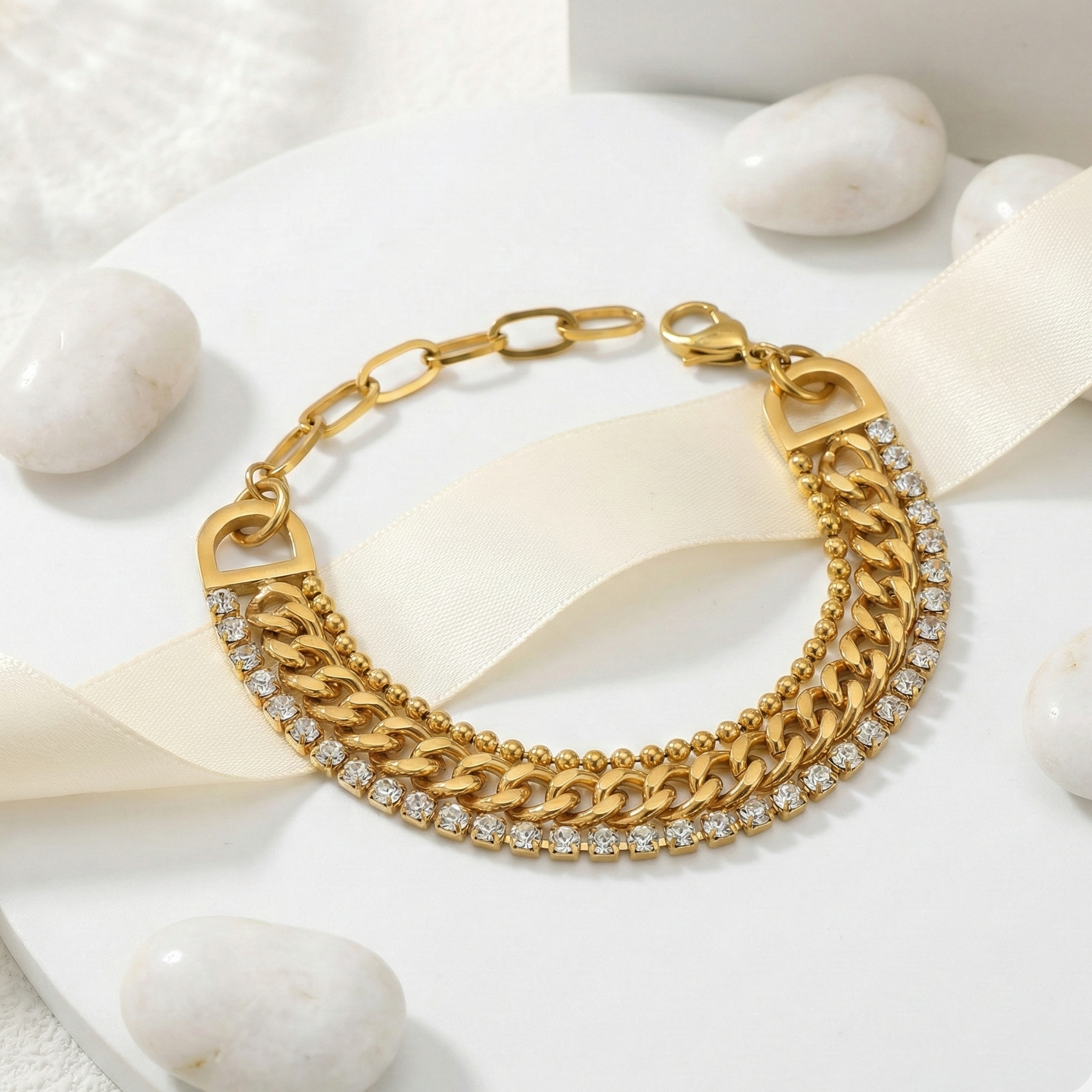 A refined blend of strength and sparkle. The Aurelia Chain Bracelet features layered gold-tone curb links accented with a delicate line of crystal brilliance, creating a perfect balance between bold structure and soft elegance. Designed to catch the light with every movement, it sits comfortably on the wrist while making a quiet statement of luxury. Finished with an adjustable clasp for a tailored fit, this piece transitions effortlessly from everyday wear to elevated evenings.